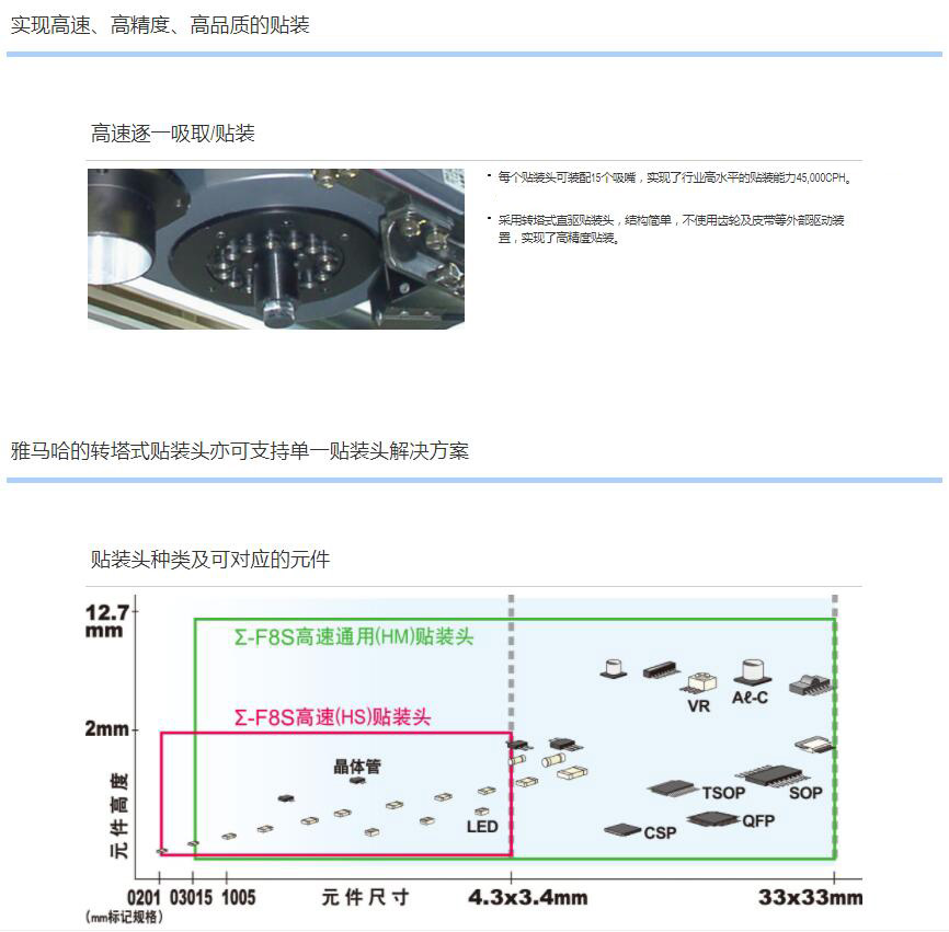 1.轉塔式貼裝頭實現1臺貼裝頭支持貼裝多種元件,全面實現快速、通用、高運轉率。