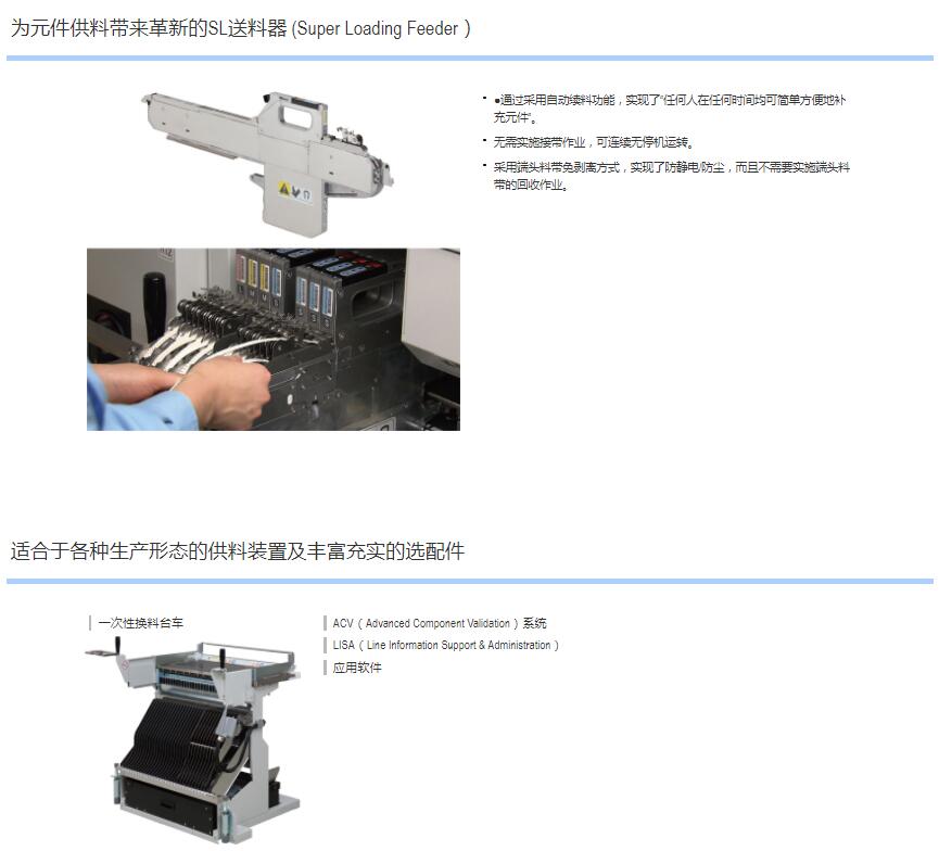 Σ-F8S 高端模塊貼片機1.轉塔式貼裝頭實現1臺貼裝頭支持貼裝多種元件,全面實現快速、通用、高運轉率。2.以4梁、4臺貼裝頭實現同級快速150,000CPH。3.直驅式貼裝頭實現高速、高精度貼裝。4.SL送料器 (Super Loading Feeder) 開拓補料作業新時代。