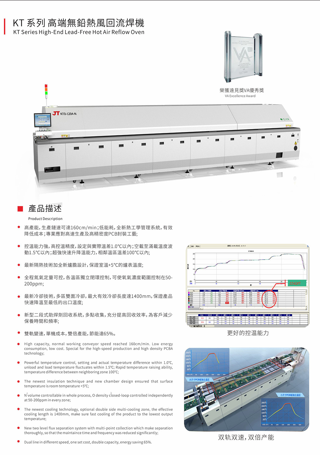 高產能,正常生產鏈速可達160cm/min;低能耗,全新熱工學管理系統,有效降低成本.專業應對高速生產及高精密度PCB封裝工藝.控溫能力強,高控溫精度,設定與實際溫差1.0℃以內;空載至滿載溫度波動1.5℃;超強快速升降溫能力,相鄰溫區溫差100℃以內.隔熱技術加全新爐膽設計保室溫+5℃左右的爐表溫度.全程氮氣定量可控,各溫區獨…